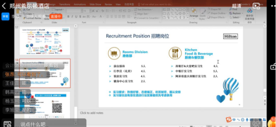 为推进2024届毕业生顺利就业,继续实现“稳就业”目标,2023年3月14日,以钉钉会议形式,jinnianhui今年会举办“职为你来”空中宣讲会。学工主任张昂“牵桥搭线”主持会议,郑州希尔顿酒店与同学们“隔空”相聚。