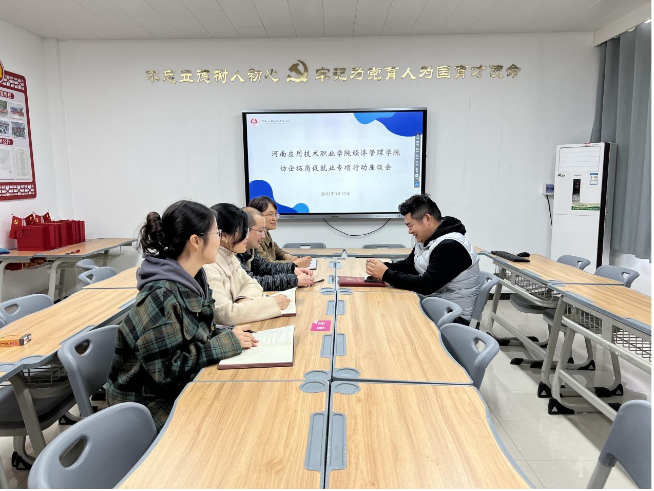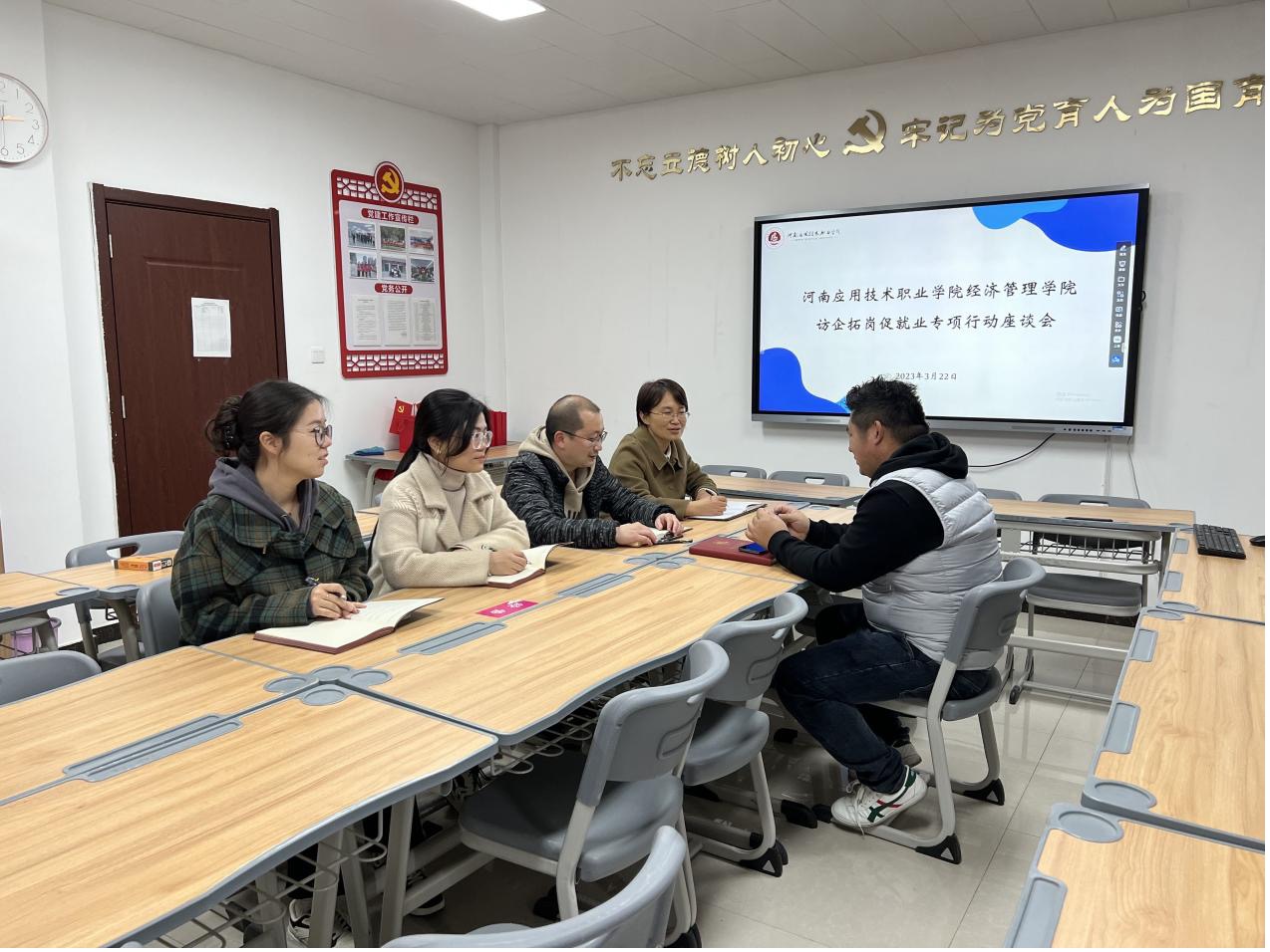 为深化校企合作交流,拓展毕业生就业渠道,3月22日,jinnianhui今年会在A505开展访企拓岗促就业专项行动座谈会。河南沧海房地产营销策划有限公司总经理王世勇、校企合作与就业处副处长张万仑及相关教师出席座谈会。副书记王盼红主持会议。