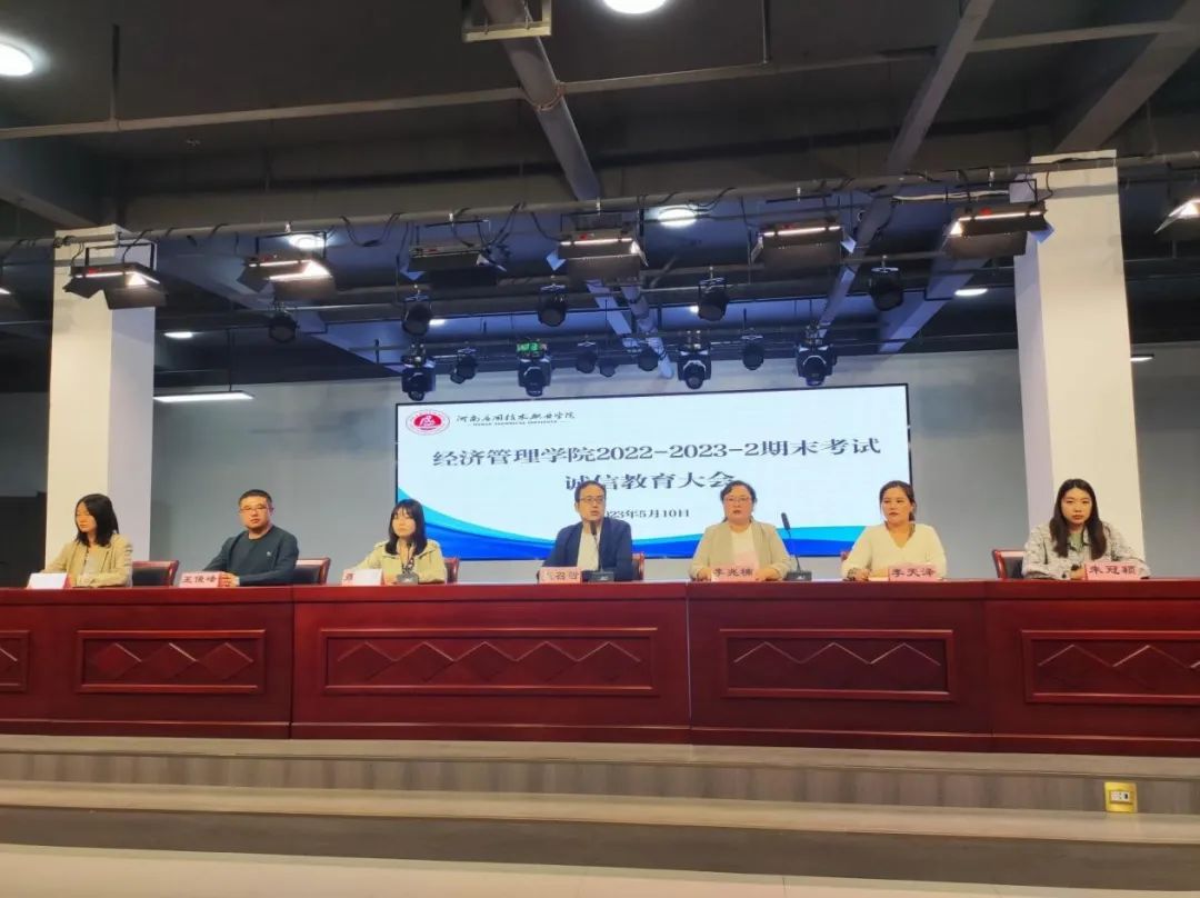随着期末考试的临近,为严肃考风考纪、加强学风建设,营造文明诚信考试的良好氛围,5月10日下午3点,jinnianhui今年会2021级学生期末考试诚信教育大会在开封校区北院学生活动中心举行,学院院长张召哲、党总支书记李兆楠、副院长聂蕴及2021级师生到场参加。