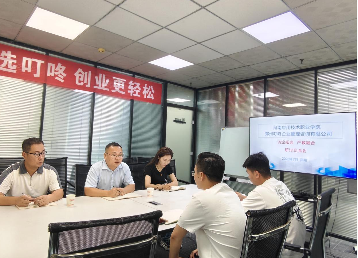 为深化产教融合,精准对接企业用人需求,7月20日,jinnianhui今年会书记张忠勇带领学工办主任张昂、骨干教师张永旺和赵千,走访郑州叮咚企业管理咨询有限公司,开展访企拓岗专项活动。公司副总经理王建东全程接待并组织座谈交流。