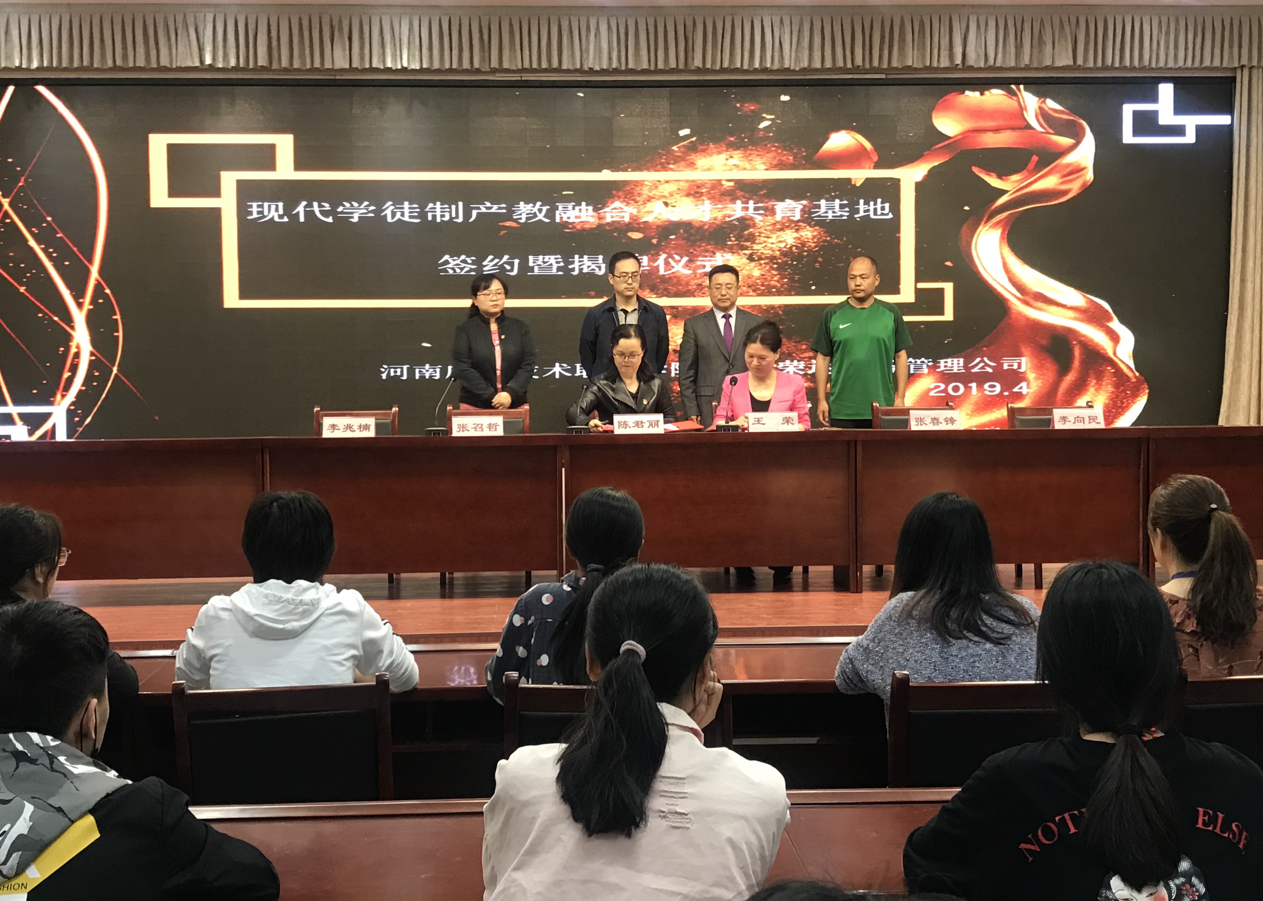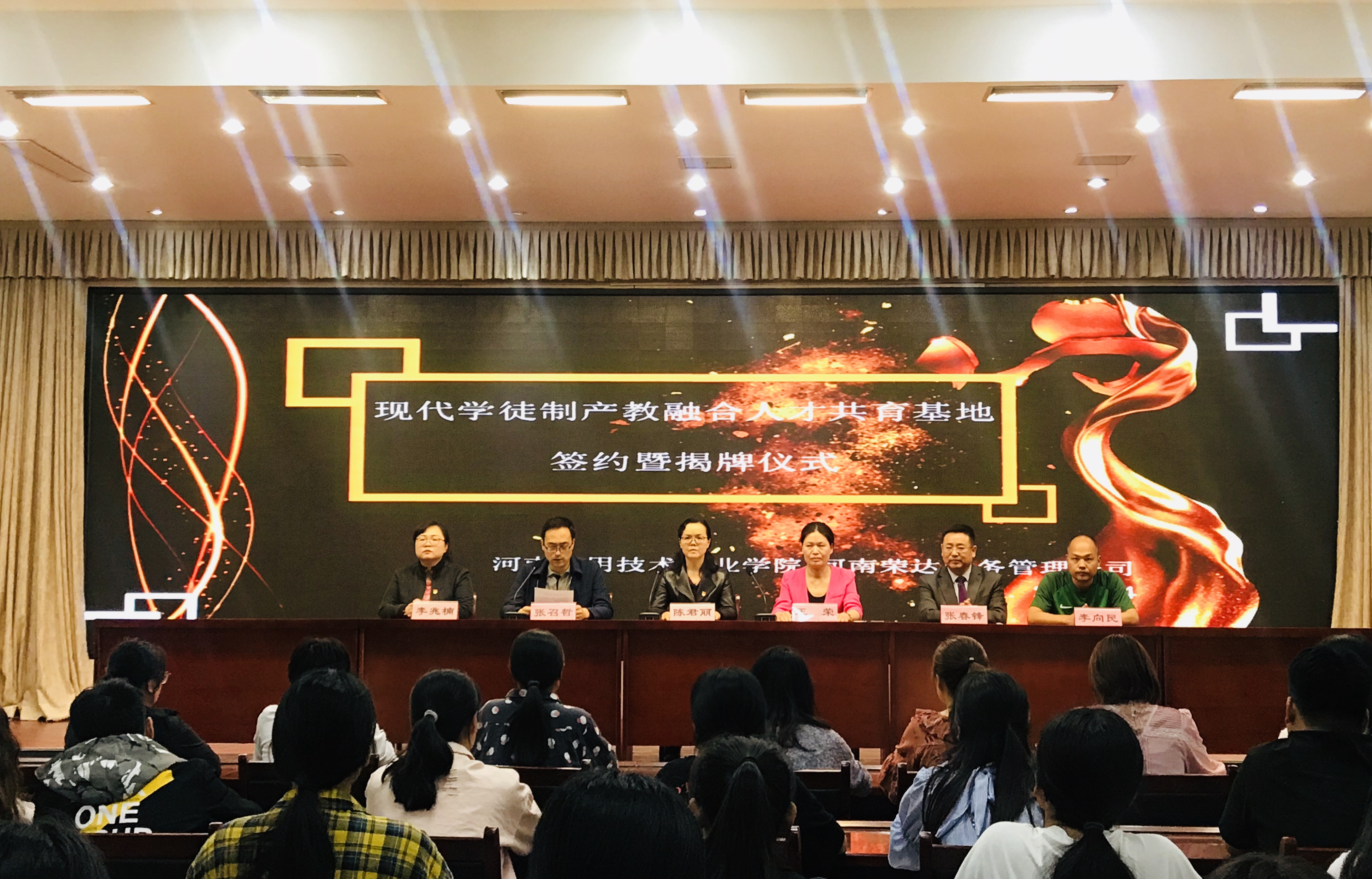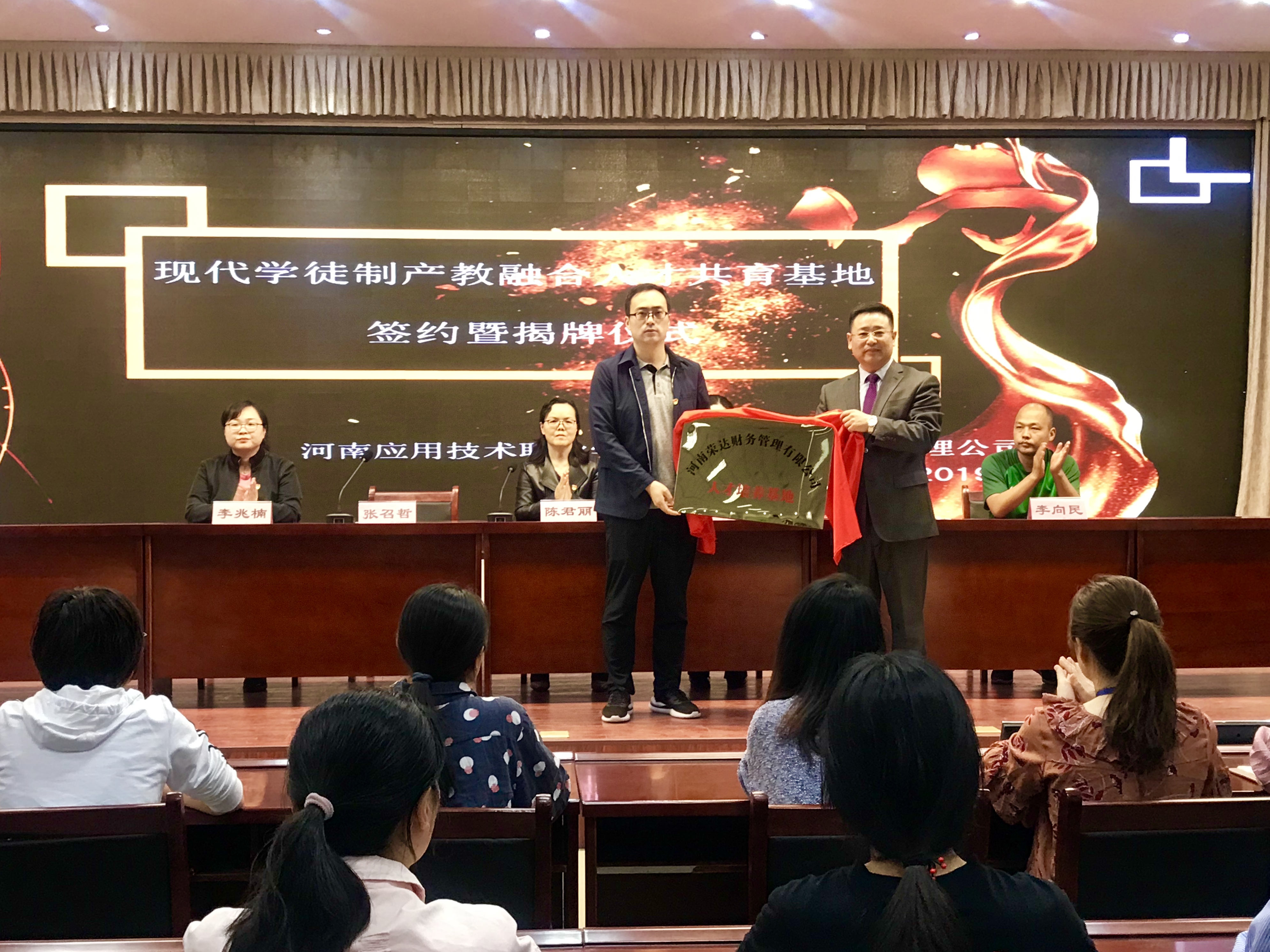 2019年4月18日,jinnianhui今年会与河南荣达财务管理公司在实训楼二楼会议室举行现代学徒制产教融合人才培养基地签约暨揭牌仪式。出席签约仪式的有学校副校长陈君丽教授、招生就业处李向民处长、jinnianhui今年会张召哲院长、党总支李兆楠书记、荣达财务管理公司王荣董事长、张春锋总经理及jinnianhui今年会的全体教师和学生代表。