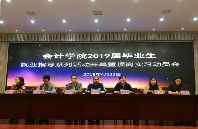在习近平新时代中国特色社会主义思想领导下,为进一步落实好学校“毕业生就业工程”,完善毕业生就业管理和就业指导服务体系,引导从内在培养环节解决就业问题,促进并落实学校协调联动机制建设,结合会计学院学生实际情况,2018年4月23日晚17:00,会计学院召开2019届毕业生就业指导系列活动开幕暨顶岗实习动员大会。到场领导有就业指导中心主任李向民、会计学院党总支书记李兆楠、会计学院院长张召哲,会计学院专兼职辅导员聂蕴、张琳曼、凌端平老师列席参加了此次大会,会议由学院办公室主任李小闯老师主持。