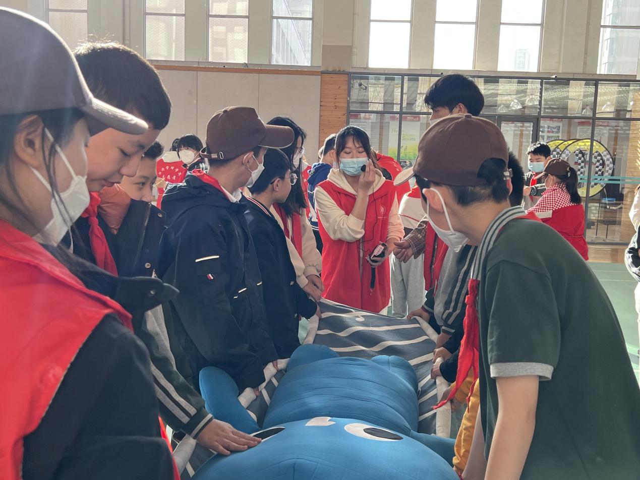 毛毯担架计时赛:大灾发生时,专业救援人员往往无法第一时间到达现场,可以利用身边的物品如毛毯、窗帘等制作担架运送受伤人员,有许多经验和智慧可以避免二次伤害。