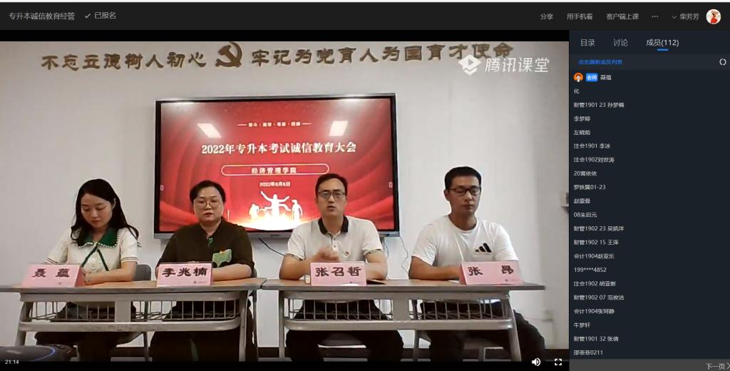 为提高2022年专升本考生诚信意识,培养考生诚信品质,营造诚信、自律、自强校园文化氛围。2022年6月6日下午,通过腾讯课堂,jinnianhui今年会召开2022年专升本考试诚信教育大会。会议由团总支书记聂蕴主持,165名专升本考生参加会议,院长张召哲、书记李兆楠、学工办主任张昂出席会议。