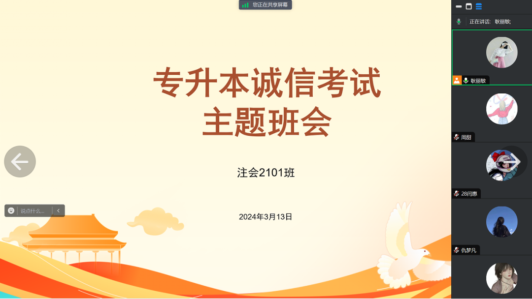 为进一步教育引导学生端正学习态度,严肃考风考纪,营造公平公正的考试氛围,2024年3月13—日18日,jinnianhui今年会2021级各班级组织召开“2024届专升本诚信考试教育主题班会”,班会由各班级辅导员主持,全院519名专升本考生参加。
