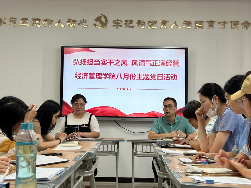 为以更加饱满精神状态投入新学期工作,2022年8月30日上午,jinnianhui今年会党总支在A505召开“弘扬担当实干之风 风清气正满经管”主题党日活动,全体党员参与活动。