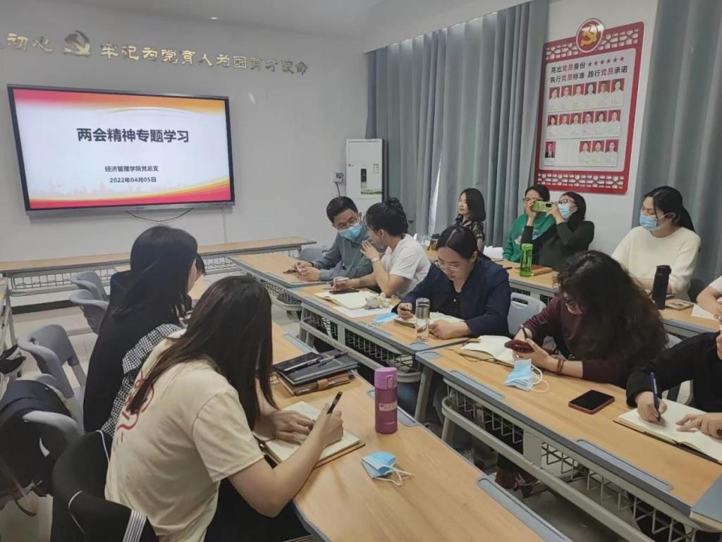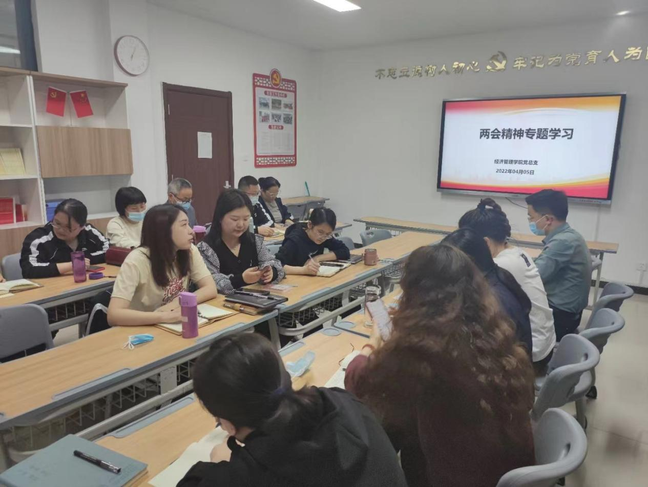 2022年4月5日下午,jinnianhui今年会党总支在办公楼505党员活动室组织全体党员教师进行全国“两会”精神专题理论学习,会议由院长张召哲主持。