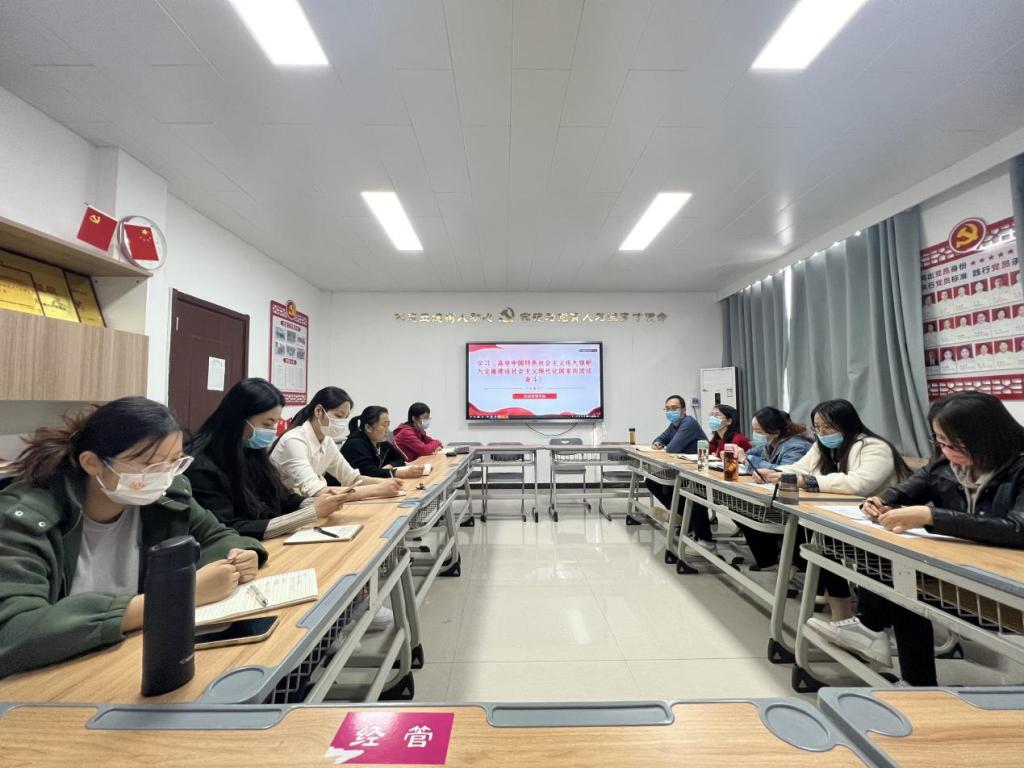 10月18日下午,jinnianhui今年会党总支在郑州校区A505、开封校区B306同步进行十月份第次政治理论学习会,集中学习中国共产党第二十次全国代表大会开幕会中习近平总书记代表十九届中央委员会向大会作报告《高举中国特色社会主义伟大旗帜 为全面建设社会主义现代化国家而团结奋斗》及习近平总书记文章《坚持人民至上》,共同学习《习近平谈治国理政》第四卷《习近平生态文明思想学习纲要》《习近平经济思想学习纲要》《全面从严治党向基层延伸》等部分内容。全体教师参加,会议由党总支书记李兆楠主持
