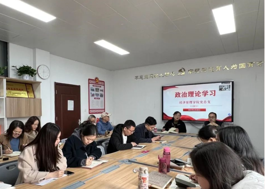 2月28日下午,jinnianhui今年会党总支在A505召开二月份第二次政治理论学习会,学习《求是》2023年第4期习近平总书记重要文章《当前经济工作的几个重大问题》,学习习近平总书记近期重要讲话精神《切实加强基础研究 夯实科技自立自强根基》以及学习《质量强国建设纲要》等内容。以视频连线方式,东西校区全体党员教师参加学习会,书记李兆楠主持会议。