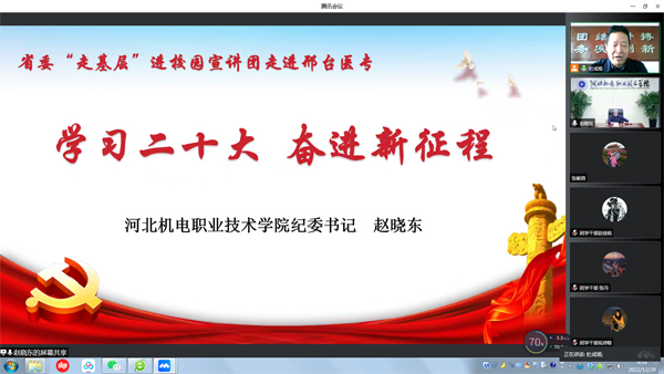 12月29日上午,学校举办党的二十大精神宣讲报告会,特邀省委“走基层”进校园宣讲分团成员、河北机电职业技术学院纪委书记赵晓东通过线上方式为beat365官网师生做题为《学习二十大 奋进新征程》的专题宣讲,学校师生代表共2...