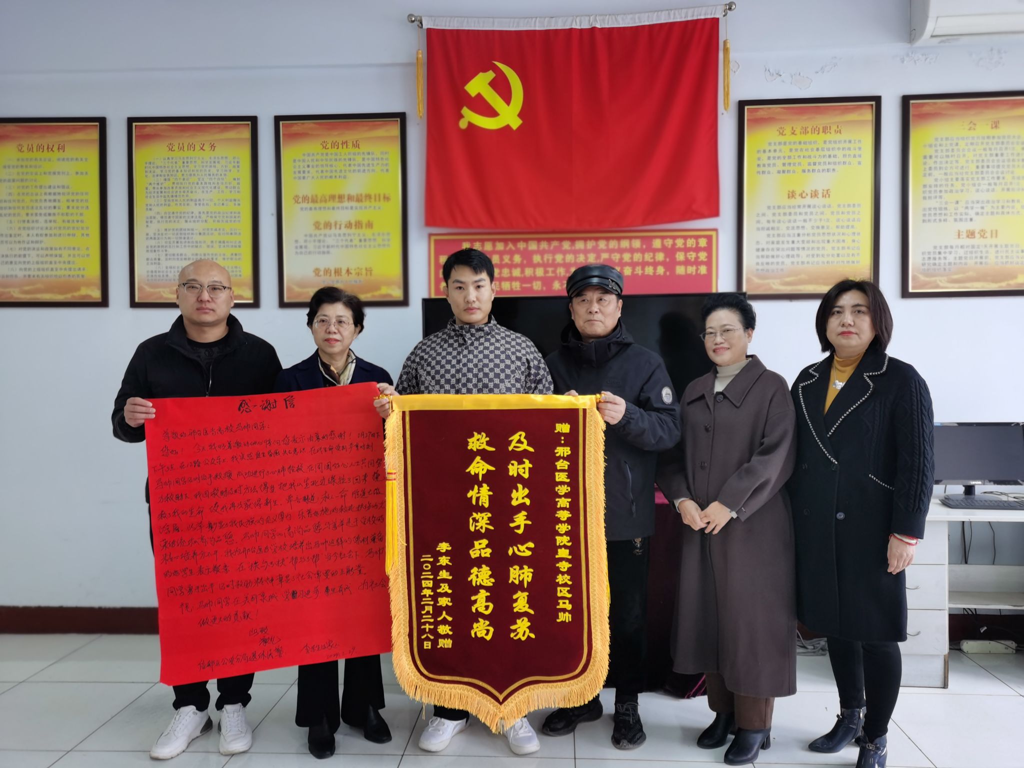 2月29日,信都区公安分局退休民警李东生及其家人来到beat365官网中医系,将一面锦旗和一封感谢信送给2023级康复治疗技术专接本1班马帅同学,对他在公交车上见义勇为的行为及学校的精心培养表示诚挚感谢。据了解,2月27日下午3点,退休民警李东生乘坐12路公交车,当车行驶到会宁至梅花寨路段时因身体不适突然晕倒,同车的马帅同学见状后即刻上前查看,发现老人无意识、无呼吸、无动脉搏动,情况危急,迅速对老人进行心肺复苏,同时请其他乘客赶快拨打120急救电话。...